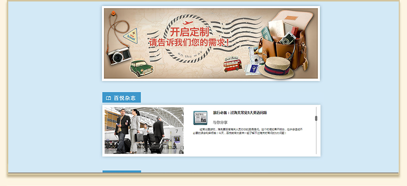 Project Description 百悦逸游于2012年初由二位资深的旅行家创办,是成都传媒集团旗下成都新闻国际旅行社有限公司的高端旅游品牌,总部位于成都高新区天府大道中段美年广场。在百悦逸游成立之前,创始团队亲自到全球三十多个国家实地考察,带着第一手的资讯和执着的信念创立了中国西部第一家真正意义上的私人定制旅行机构。百悦的旅行不是跟团挤大巴,不是十天去十个国家,更不是没完没了的... Official website address 图木舒克http://www.100.travel I want to share